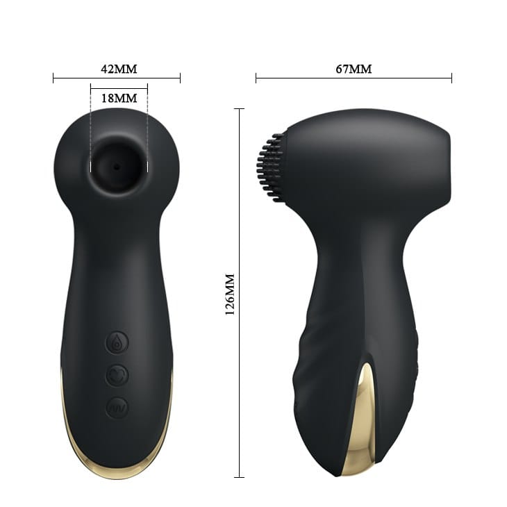 Novi luksuzni klitoralni masažer sa ukusno pozlaćenim detaljima poznatog svetskog brenda sa funkcijom usisavanja.Dvostran je i Ima 7 funkcija sisanja i 7 funkcija vibracije.Izuzetno je tih i možete ga lako koristiti gde god vam odgovara.Vodootporan je,i lako se čisti i održava.Dužine 12,6cm i prečnika 4,2cm.Koristi USB punjač.