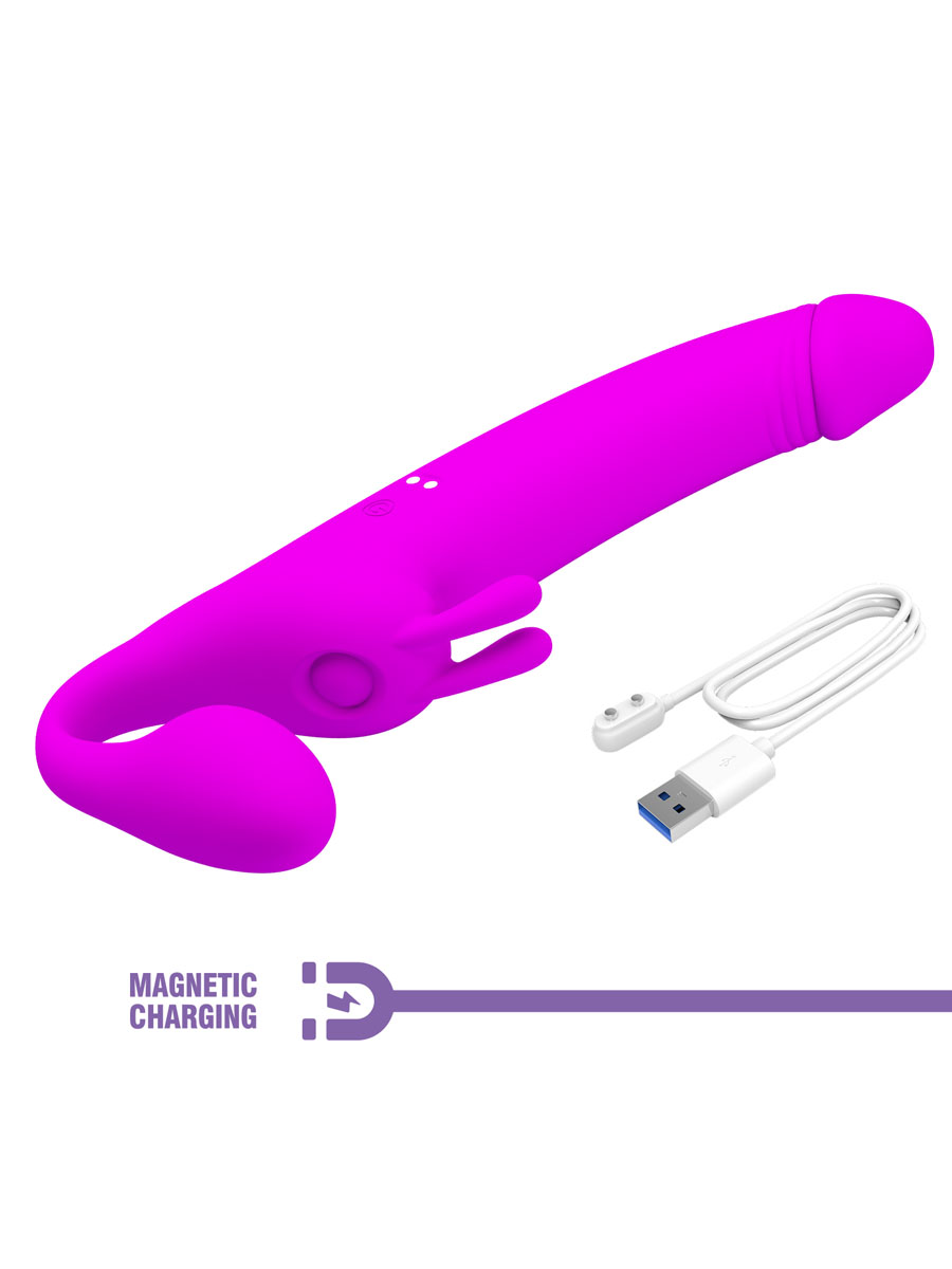 Ovo vrhunski proizvod koji donosi jednu novu dimenziju u seksualnim igrama. Ovaj strap-on bez kaiševa omogućava vam da se oslobodite standardnih ograničenja i uživate u potpunoj slobodi pokreta. Izrađen je od visokokvalitetnog silikona, koji je prijatan na dodir i jednostavan za održavanje. Materijal pruža vrhunsku udobnost i sigurnost pri upotrebi.Njegova ljubičasta boja nosi dozu elegancije, što proizvodu daje jedan nivo plus u estetici. Dizajniran je da istovremeno stimuliše oba partnera. Snažni motori smešteni oba dela vibratora nude čak 10 različitih funkcija vibracija i 10 funkcija tapkanja. Dužina celog proizvoda iznosi 28,3 cm, dok penetrirajući deo meri 16,6 cm, a prečnik u najširem delu je 4 cm. Strap on se puni preko USB kabla koji se dobije u pakovanju. Preporučuje se upotreba  lubrikanta na bazi vode.Održavanje preporučujemo sapunicom i mlakom vodom.